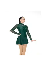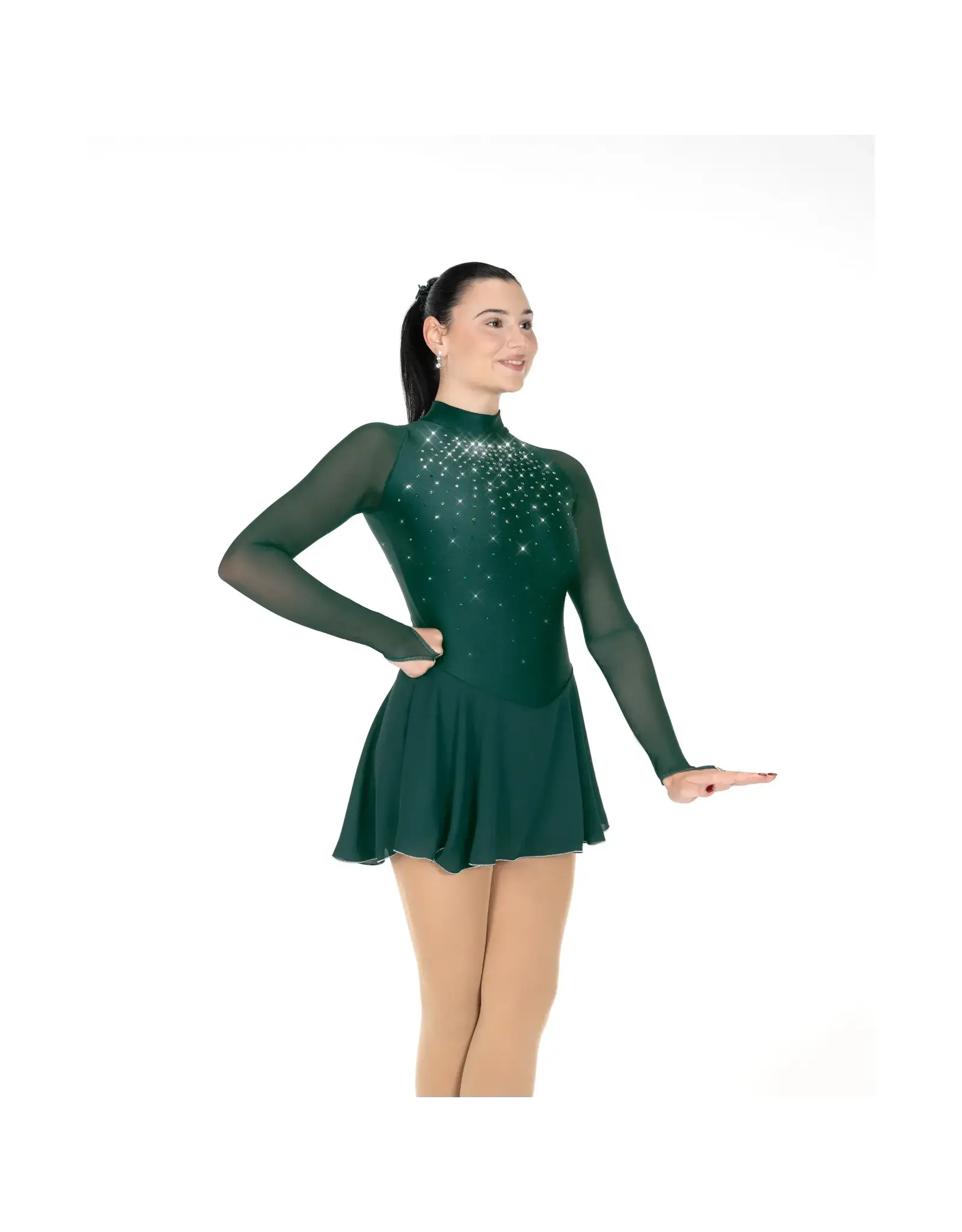 Des cristaux en cascade sur le devant de cette robe en lycra à col haut et de l'ombre, des grosses pierres claires au niveau du cou aux minuscules cristaux d'émeraude à la taille. Une fermeture éclair au dos, une jupe en géorgette assortie et de longues manches en maille avec des pointes de doigts ajoutent un style intemporel. Bordé.