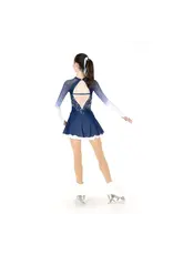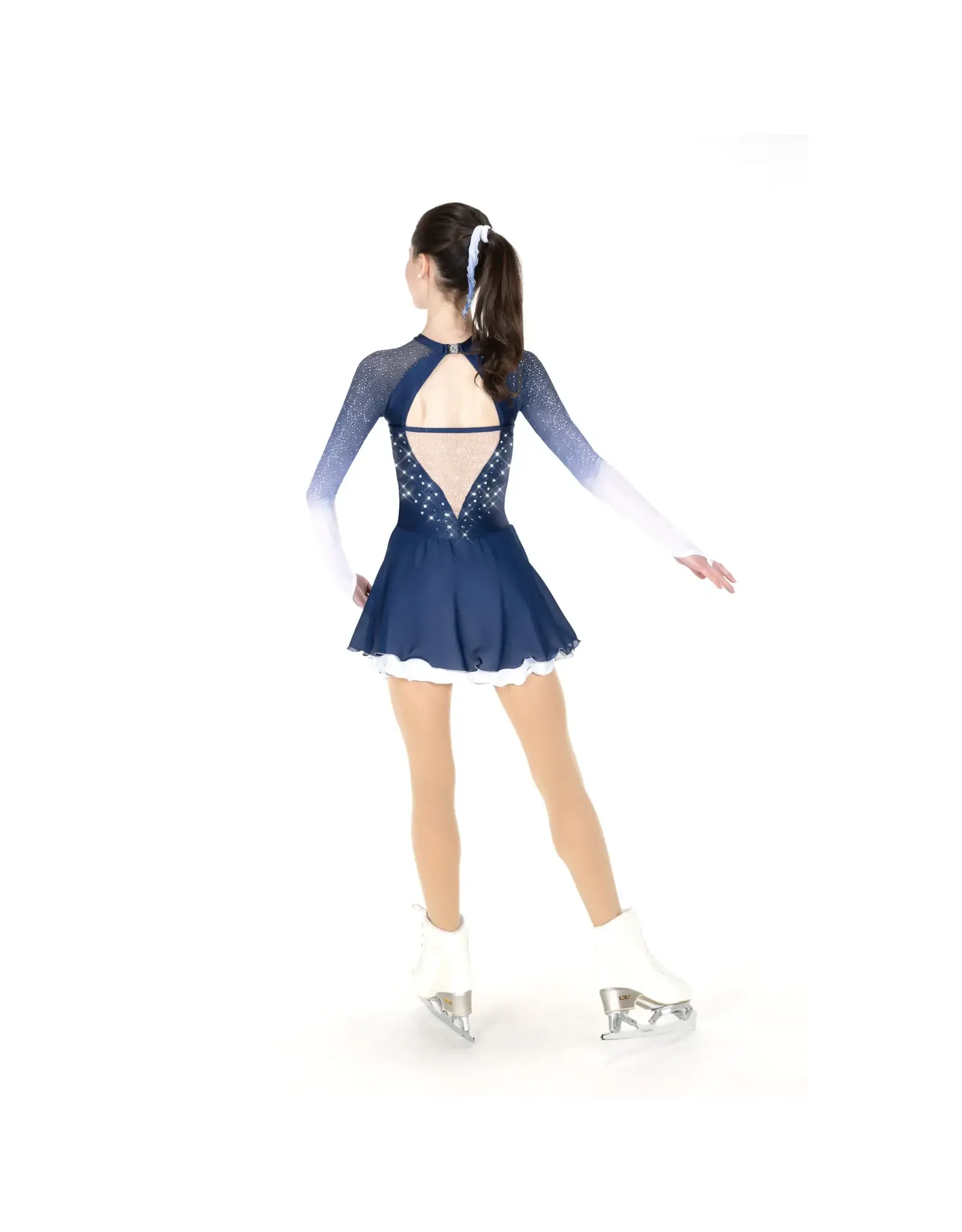 Les nuances en maille de paillettes sont magnifiques, du bleu indigo au cou au blanc glacé aux poignets de ce style intemporel. Le corsage bleu marine présente un saupoudrage étoilé de cristaux autour des découpes en maille à paillettes beige à l'avant et à l'arrière. Jupe georgette double couche de bleu marine sur blanc glacé. Entièrement doublé.